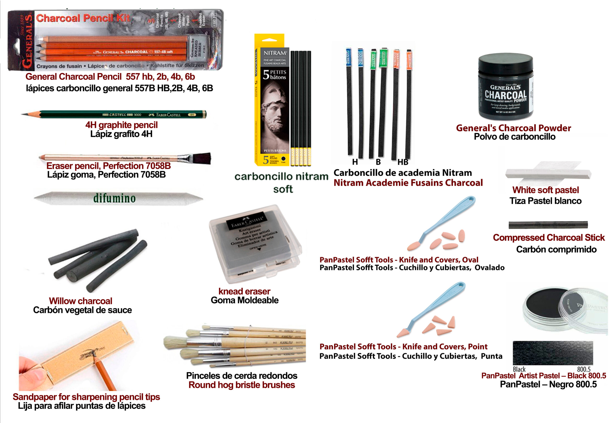 LISTA BASICA DE DIBUJO CON CARBONCILLO Aquí tienes una lista básica y auxiliar de materiales para un taller de dibujo con carboncillo: